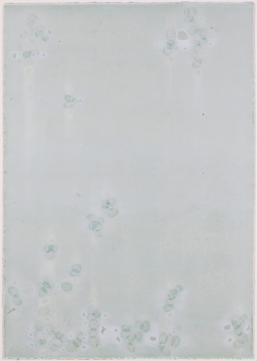 池田はスクリーンプリント(=版)を用いて、この「時間」という概念の表現を試みた。スクリーンプリントは枠に張った紗の織目からインクを押し出すことにより絵柄を刷りとる版画技法で、刷るたびにインクの厚みが紙に積層し美しいマチエールやテクスチャーを生み出すことができる。シリーズはこのスクリーンプリントの特徴であるレイヤーをロジックとして展開されていく。しかし隠された意図を知らずとも鑑賞者は作品に宿る透明感ある色彩の重層と質感ある画肌の美しさに魅了される。図らずも作家の無意識の領域だ。どんなに版という客観性を持ち込んでも版を通過して表現されるのは、実は作家自身であるようだ。そこには今日を生き、版画とは何かを常に問い続ける版画家・池田潤が転写されているのであった。