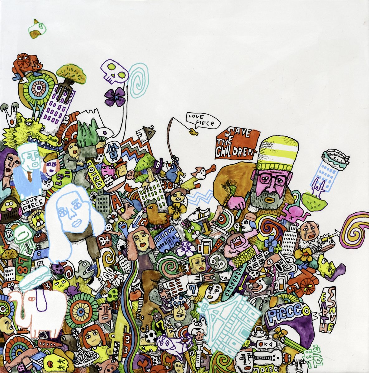 また、密教の宇宙観を図式的に配置したものが「曼荼羅」であり、そこに秩序と法則が存在するのであれば、森泉の“絵“は現実世界の模式図として有象無象がひしめき合う混沌としたリアルを思い浮かばせる。すなわち現代社会の曼荼羅、「リアル曼荼羅」なのである。この世は決して美しいものばかりではなく、美しいものを創造することだけが芸術ではない。身の回りに存在する雑多な物質や精神のイメージが集合体となり、この時代を象徴する。バラバラなイメージの集合はとても禍々しく、ケバい。しかし、そこが非常に面白おかしくもあり、その世界のなかで歯を剥き出しにしてニカッと笑みを浮かべることができるのが私たち現代人なのだ。